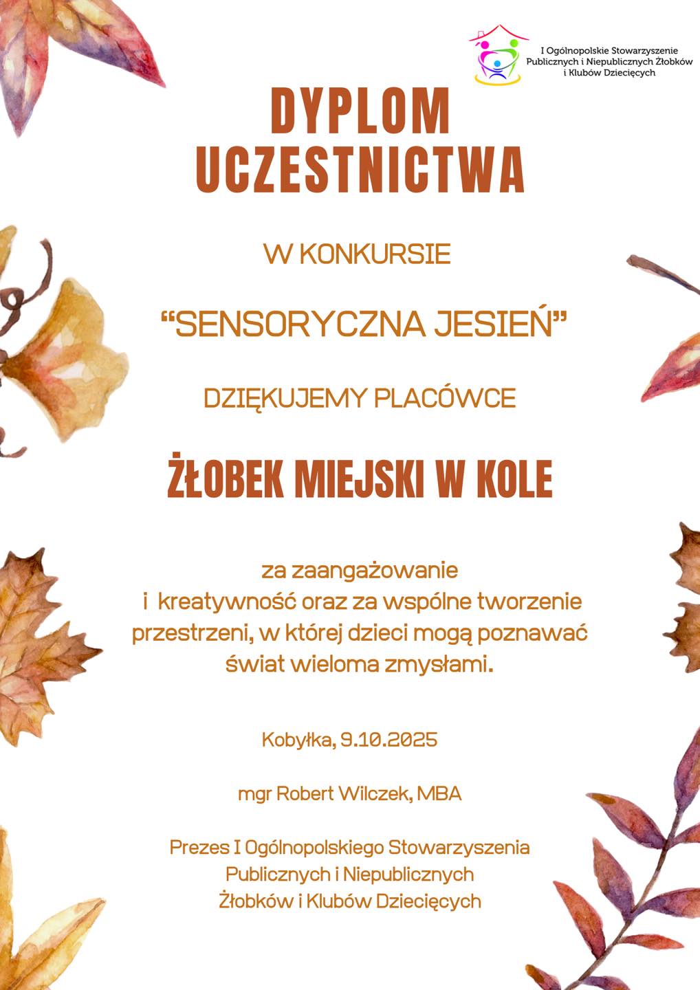 Z radością informujemy, że wzięliśmy udział w ogólnopolskim konkursie „Sensoryczna Jesień”, organizowanym przez I Ogólnopolskie Stowarzyszenie Publicznych i Niepublicznych Żłobków i Klubów Dziecięcych!
